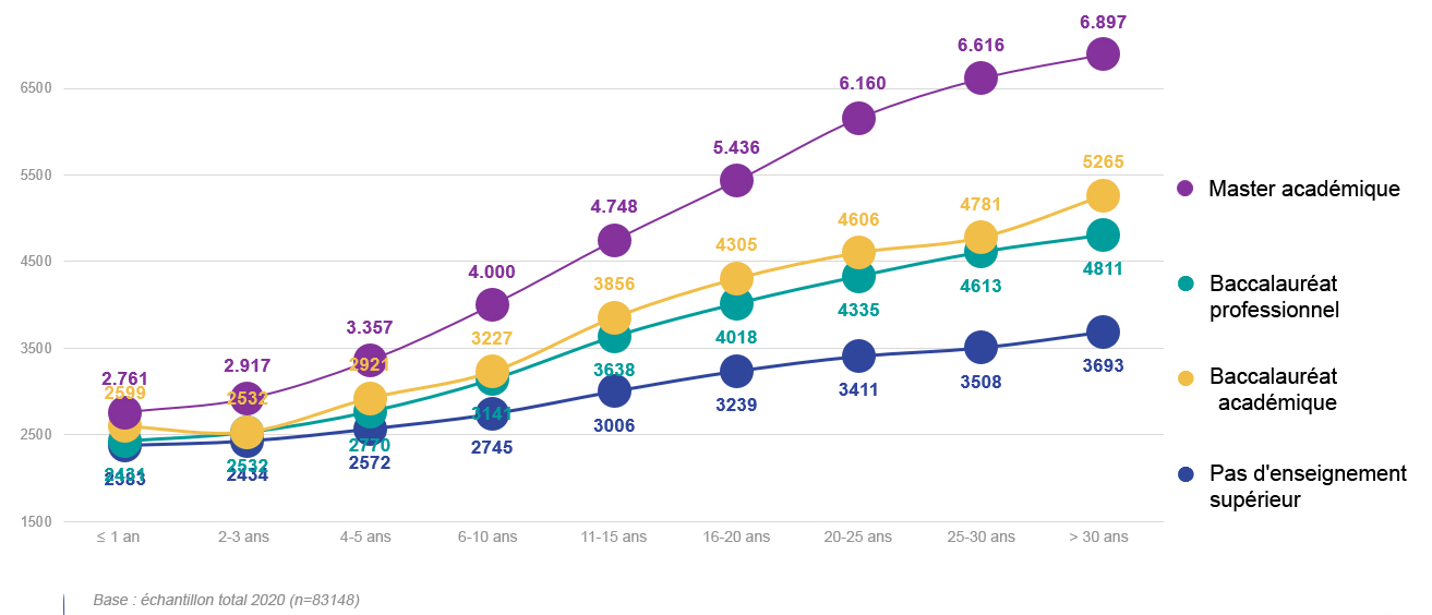 Est-il judicieux de passer des années assis sur les bancs de l'école ? La réponse est oui. Une personne titulaire d’un diplôme de l'enseignement supérieur gagne beaucoup plus en début de carrière que quelqu’un qui n’a pas terminé ses études secondaires. La rémunération des personnes diplômées augmente également beaucoup plus rapidement au fil des années. Vous trouverez ci-dessous un aperçu des tendances actuelles en matière de salaire.