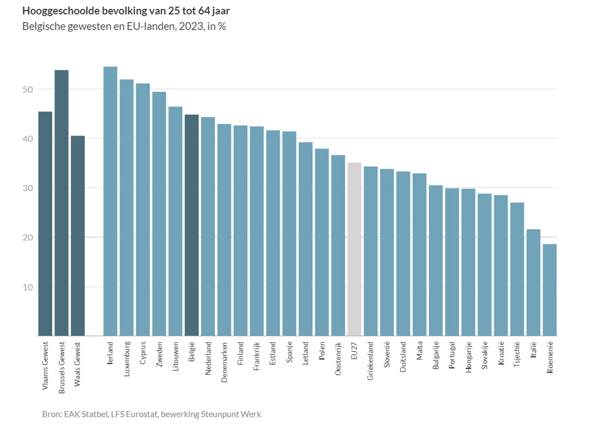- Wie als hoogopgeleid profiel een gelijkgestemde ziel zoekt, is het best af in het Brusselse Hoofdstedelijke Gewest: daar ligt het aandeel hooggeschoolden met 53,8% het hoogst, gevolgd door het Vlaamse Gewest met 45,4% en het Waals Gewest met 40,5%.