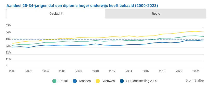 Vooral vrouwen tussen 25 en 34 jaar zetten de toon. Zo had 57,3% van hen vorig jaar een diploma hoger onderwijs tegenover 42,6% bij de mannen. Opvallend: de kloof tussen hoogopgeleide vrouwen en mannen wordt elk jaar groter: van 5,9 procentpunten in 2000 tot 14,7 procentpunten in 2023.