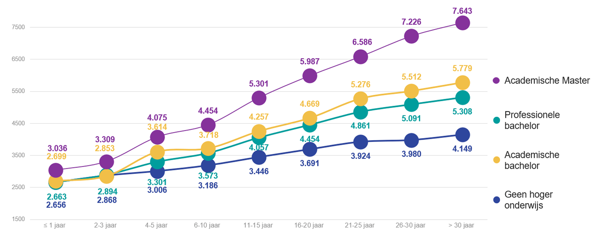 Dus ja, verder studeren en een hoger diploma (proberen) behalen loont inderdaad, vanaf de start én ook later in je loopbaan. Je weet dus waarom je studeert of gestudeerd hebt...