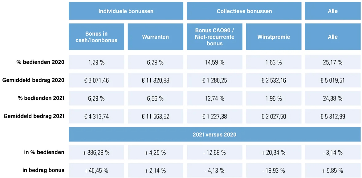 Overzicht bonussen bedienden profit in % en bedragen, 2021 en 2020 en de vergelijking. (Bron: Acerta | Klik op de tabel om deze te vergroten.)