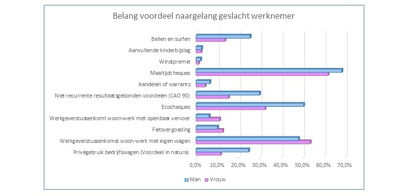 Het tweede grootste verschil zien we tussen mannen en vrouwen. 8 van de 11 verloningsvoordelen blijken voor vrouwen minder frequent voor te komen. Een bedrijfswagen bijvoorbeeld zie je 2,9 keer minder bij een vrouw dan bij een man, zelfs wanneer ze even oud zijn en in dezelfde sector, in een organisatie van dezelfde grootte en met hetzelfde statuut werken. Een kleine nuance: managementniveau of brutoloon werden niet bekeken als controlevariabelen, dit is uiteraard essentieel om hier een gefundeerde uitspraak over te doen.